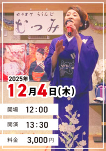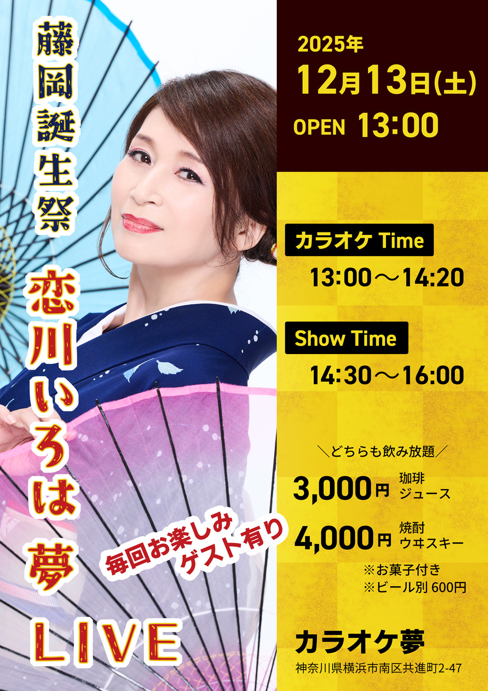 | 時間 | 開店 13:00 カラオケタイム 13:00~14:20 ショータイム 14:30~16:00 |