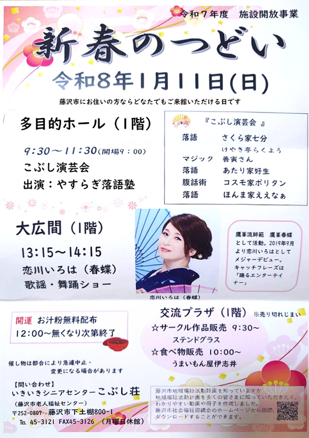 | 時間 | 9:00 開場 9:30~11:30 こぶし演芸会 13:15~14:15 恋川いろは歌謡・舞踊ショー |