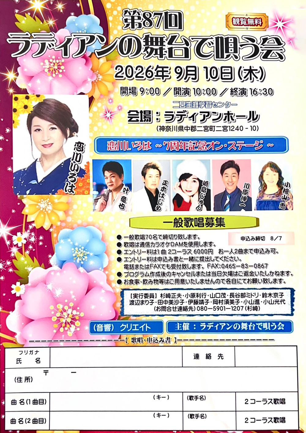 | 料金 | ◆参加費 ①歌唱参加費 6,000円(1曲・2C) ②一般デュエットコーナー 10,000円(1曲・フル) ③歌手とデュエットコーナー 10,000円(1曲・2C) ※歌唱参加の方のみお弁当・お茶付き/複数コーナー参加の方、割引きあり ◆観覧費 |